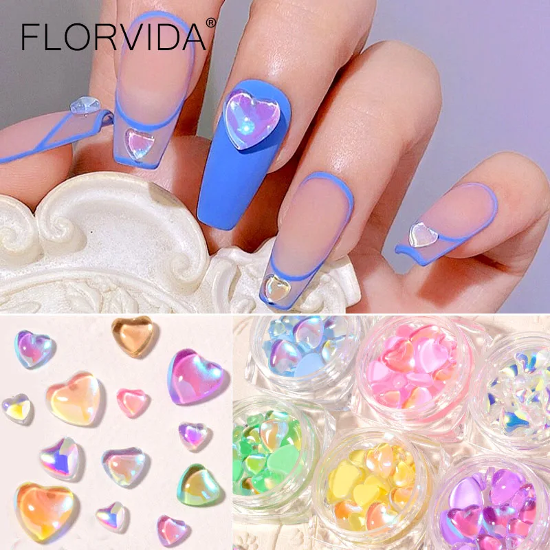 FlorVida 20pcs Sweet Heart Mermaid Rhinestone Beads Holographic Crystal Gems Stones For Nail Art Decorations Mix Size Box Kawaii