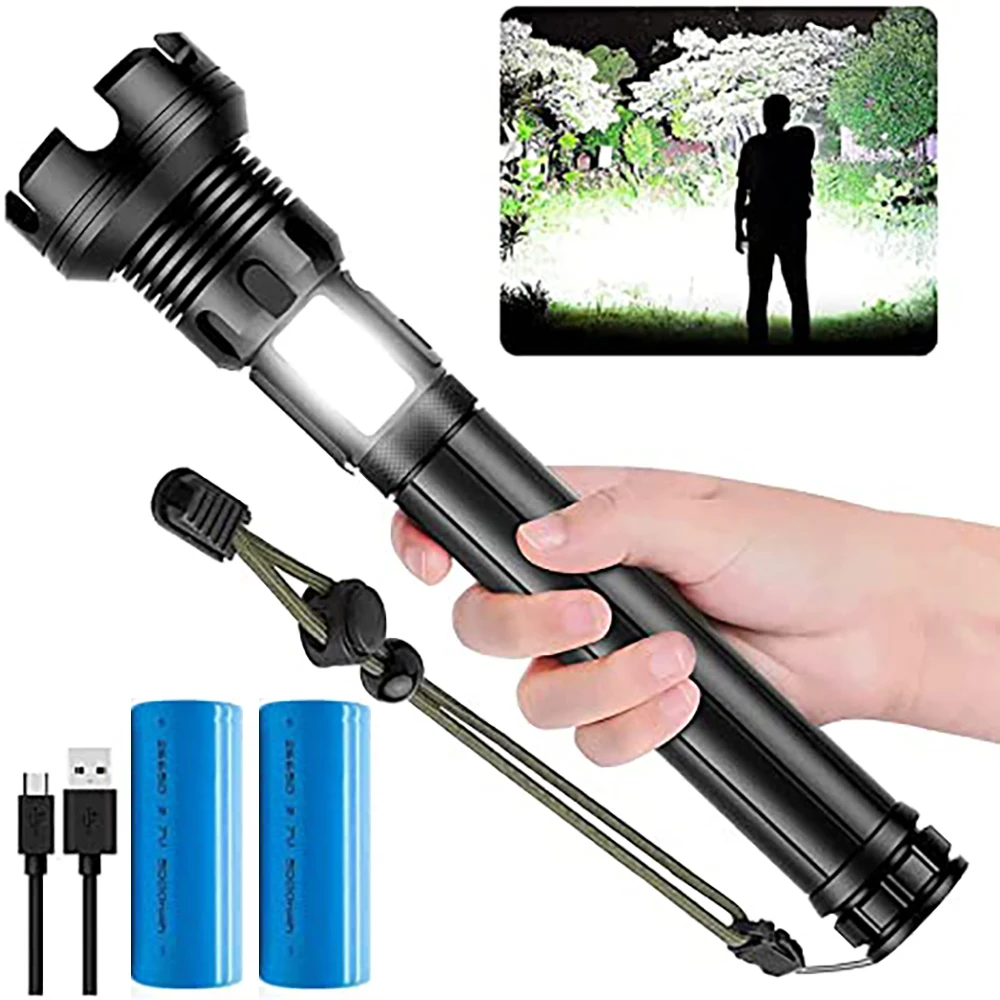 【9000 Lumen HIGH POWER LED FLASHLIGHT】Tactical Flashlight High lumen, with Built-in XHP90 Super Bright LED for a maximum output of up to 9000 lumens, 8000K Sunshine light illuminate a Bright light over the length of about two football fields and reaches nearly 2000ft.【Rechargeable Flashlight,Long-lasting, power bank 】Rechargeable Flashlight High Lumens, 2pcs rechargeable batteries included, 6000mah large battery capacity for a long battery life, this high Lumen rechargeable flashlight could run up to 12hours. USB input port allow you quickly charge the flash light and the USB output port help this led flashlight work as a emergency power bank to charge your phone, camera and etc.【7 Modes & Adjustable Foucs】Upgrade P90 high lumen LED Flashlight, Brightest flashlight with 7modes: High/Medium/Sos/High COB/Medium COB/Red COB/RED flashlight COB(Quickly double click the button to get the COB modes on), combine with zommable function make this Tactical flashlight more tactical, spotlight for long range and floodlight for large area illumination. This 90000Lumen tactical flash light is great for emergency, camping, inspections,etc. Flashlights For Police,and Everyday Use.【Durable, Waterproof, Practical】This Heavy Duty flashlight made of aerospace grade aluminum alloy, Non-slip and Durable, IPX5 waterproof for convenient usage in various extreme weather. ONE KEY TURN OFF Function means Long press the switch 2 seconds to directly turn off the flashlight at any modes.and this rechargeable flashlight have power display light help you see the rest power at a glance. remind you charge the flashlight in time, practical as camping flashlight or EDC Flashlight. Parameters of Rechargeable Tactical FlashlightHigh power, 9000 lumen brightest flashlightLED chip: CREE XHP90Brightness: 9000 lumenModes: 7 ModesBattery Type: 2x Rechargeable Battery/includedBattery Capacity: 2x 3000mAhIP rate: IPX5 waterproofSize: 10.2(length)* 2.4(diameter)Flashlight Weight:1.2pounds